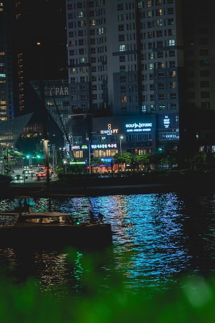 一直到七點半快八點才意識到,因為韓國緯度比台灣高的關係,一直到了快八點天才接近全黑。走在沙灘旁,深藍的海與天色曖昧交錯,有種來到了異世界的錯覺。